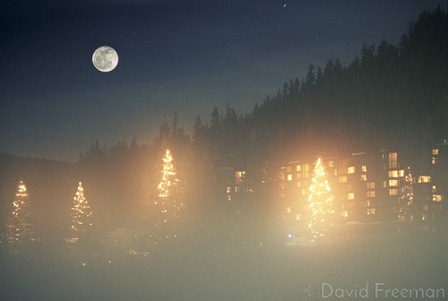 SKU VP293 Category Lake Tahoe and the Sierras Tags fog, Full moon, Christmas lights on Pine trees